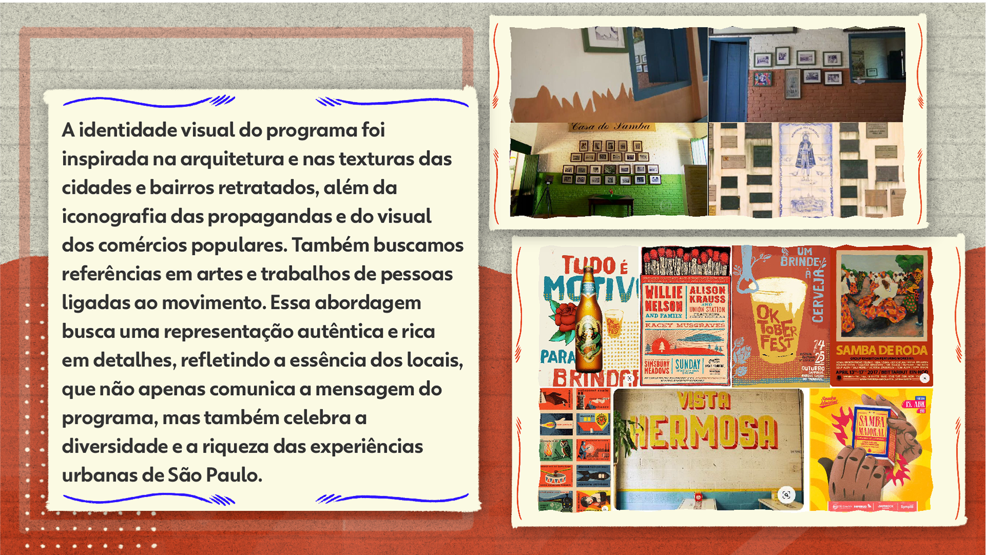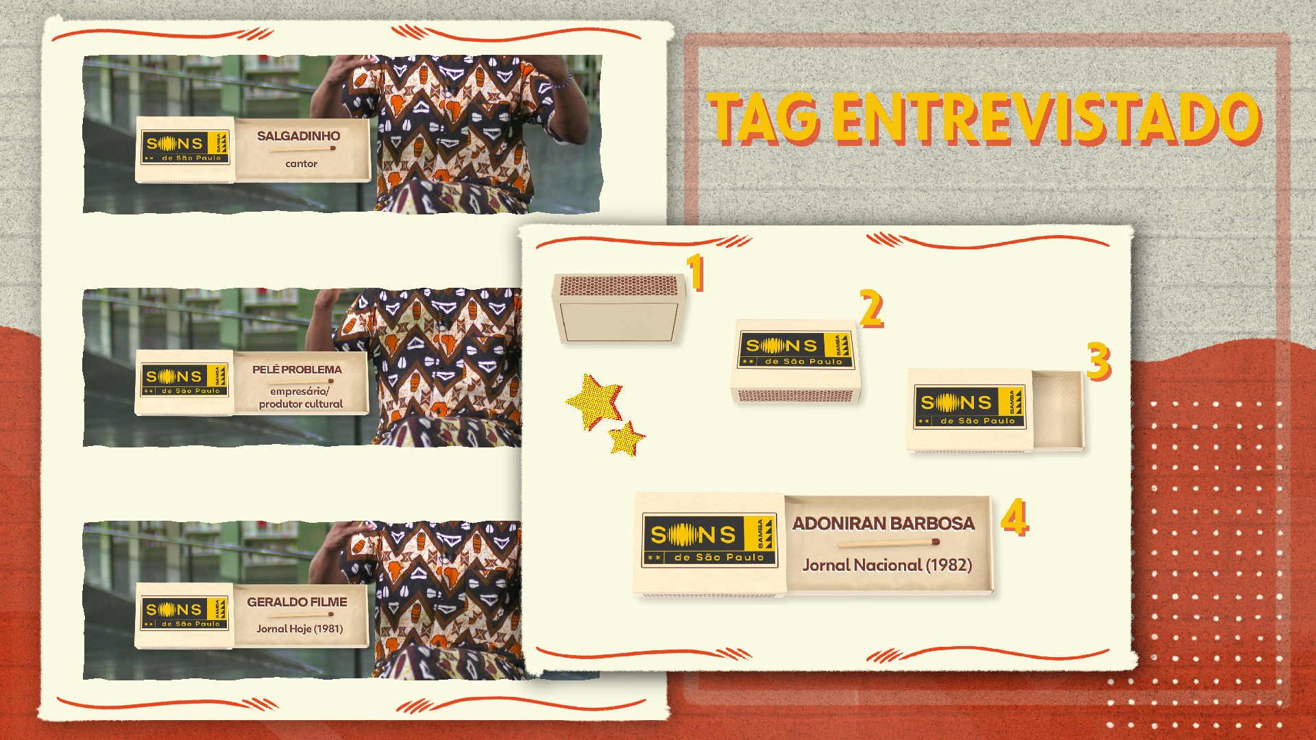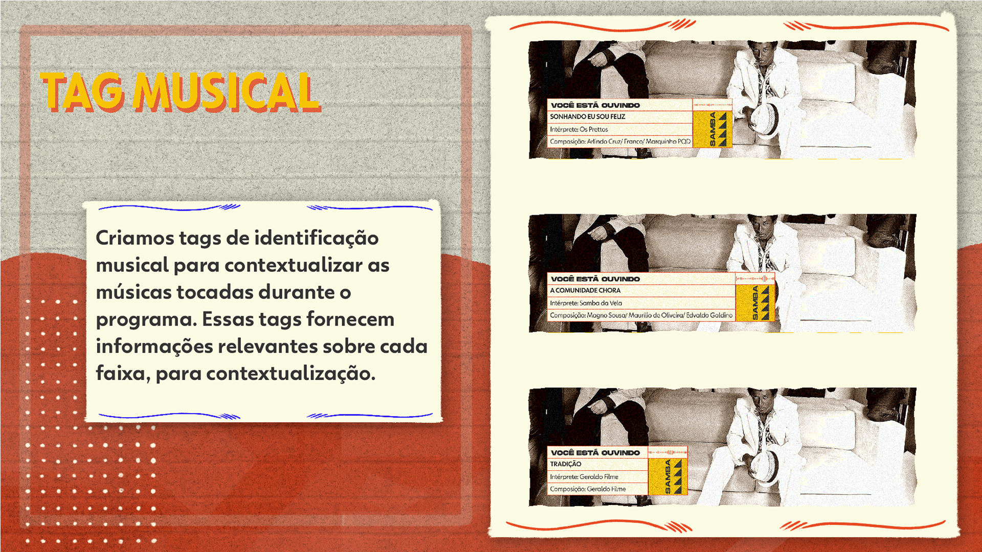 This project refers to the second edition of the special program "Sons de São Paulo," produced by TV Globo in 2023. In this edition, the central theme is "Samba," exploring its rich history and significance in the state of São Paulo. The goal is to celebrate the essence of this cultural expression, highlighting its evolution, the artists who represent it, and its influence on Paulistano identity. Through an engaging narrative and a carefully crafted visual identity, we aim to provide the audience with an immersive experience of samba culture, emphasizing its relevance and role in Brazil's musical diversity.